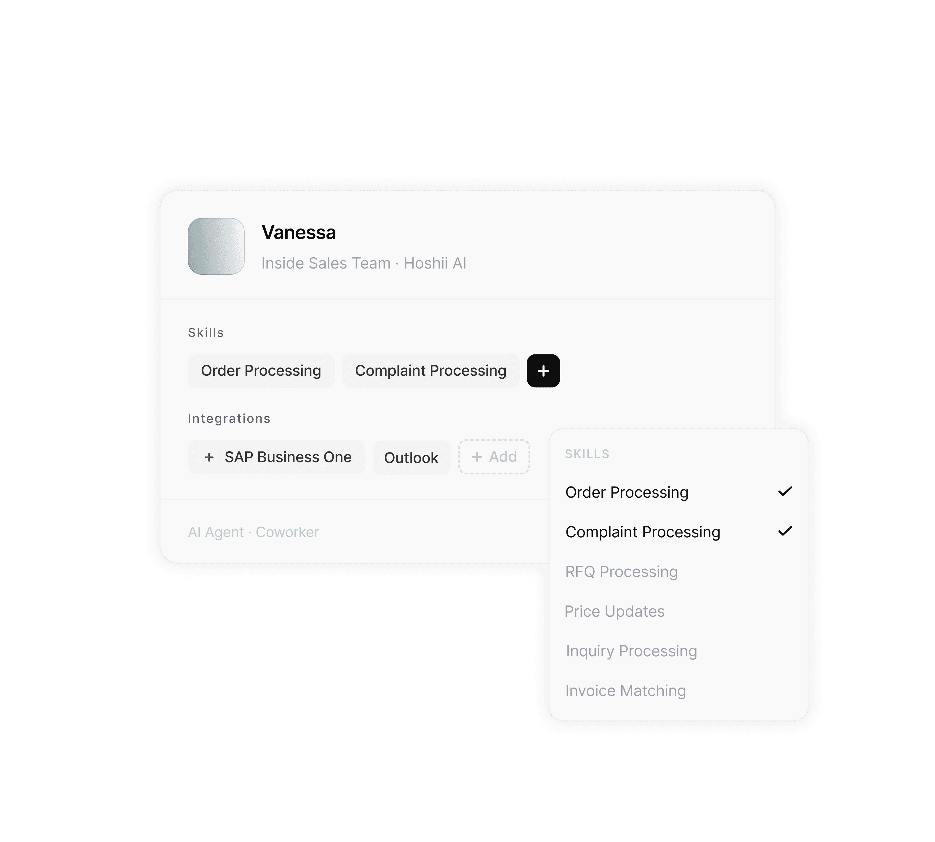 Deploy AI Agents built for B2B commerce, each equipped with ready-made Skills for the incoming emails your team handles every day.